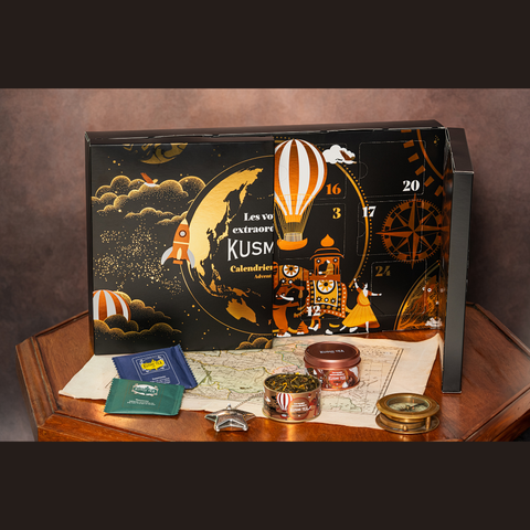 クスミティーのアドベントカレンダーは、夢と驚きがぎゅっと詰まった毎年人気の限定コレクション。今年は「めくるめく冒険旅行」をテーマにしたデザインで登場。12月1日からクリスマスまで、ワクワク&どきどきしながら小窓を開けば、バラエティー豊かなフレーバーのティーバッグやミニ缶、オリジナルの紅茶ゼリー、そして毎年デザインが変わるインフューザーなどのささやかなプレゼントが現れ、クリスマスの魔法に包まれます。