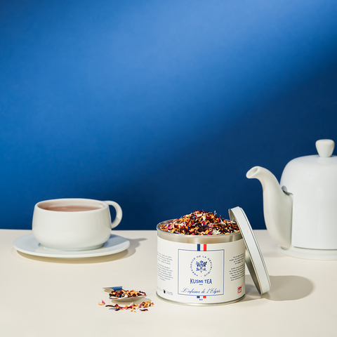 フランス大統領官邸、エリゼ宮からの依頼で誕生したスペシャルブレンドのハーブティー版。 ハイビスカスの酸味をリンゴの甘さがやさしく包み、まろやかな味わいに仕上げました。さらにチェリーとブルーベリーの甘酸っぱさが重層的に重なり、軽い飲み口ながらも奥行きのある味わいに。 矢車菊の白と青、ハイビスカスの赤が茶葉を彩り、フランス国旗のトリコロールを模した小粋な演出も魅力的。