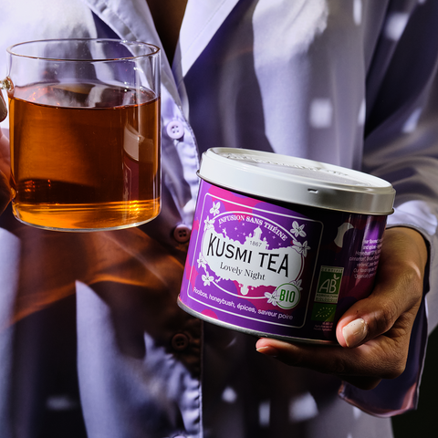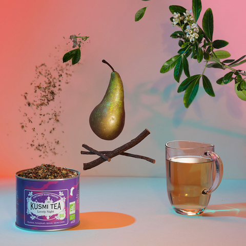 穏やかな味わいのルイボスティーと、アフリカ原産のハーブ「ハニーブッシュ」を主役に据えたハーブティー。ハニーブッシュのハチミツを思わせる甘い香りに、リンデンやバーベナなどやさしい香りの安らぎのハーブが寄り添い、清涼感がすーっと広がります。さらにリコリスとシナモンのマイルドな甘味や刺激がトーンをなし、洋ナシのアロマがフルーティーなニュアンスを添え、リラックス効果抜群です。
